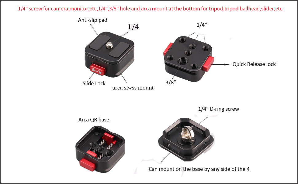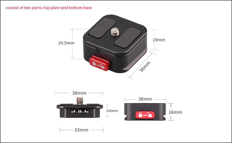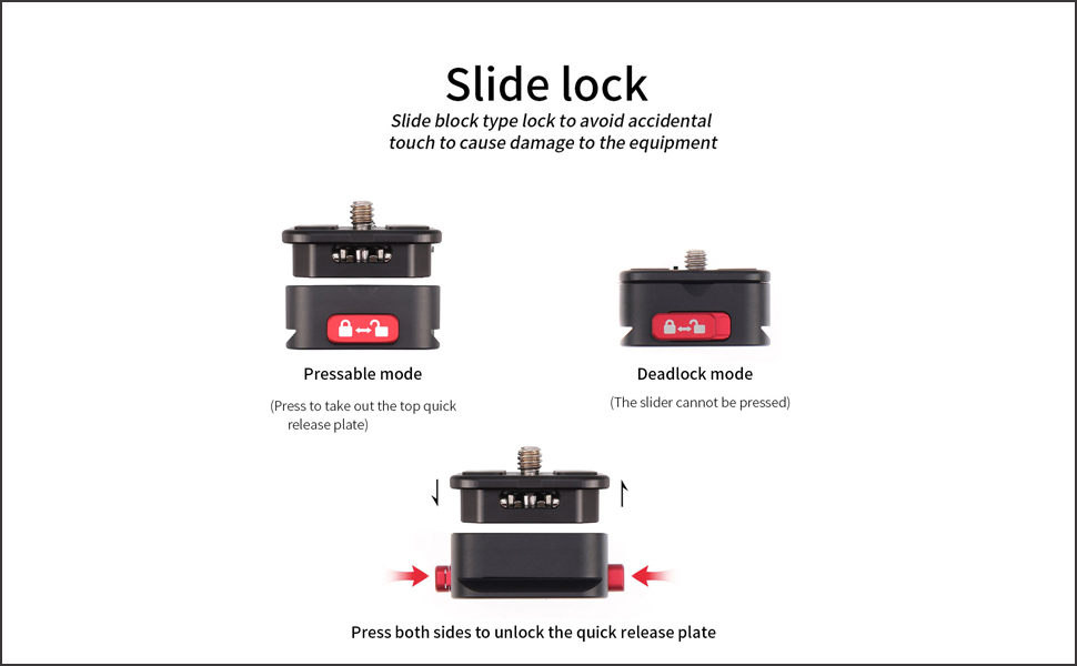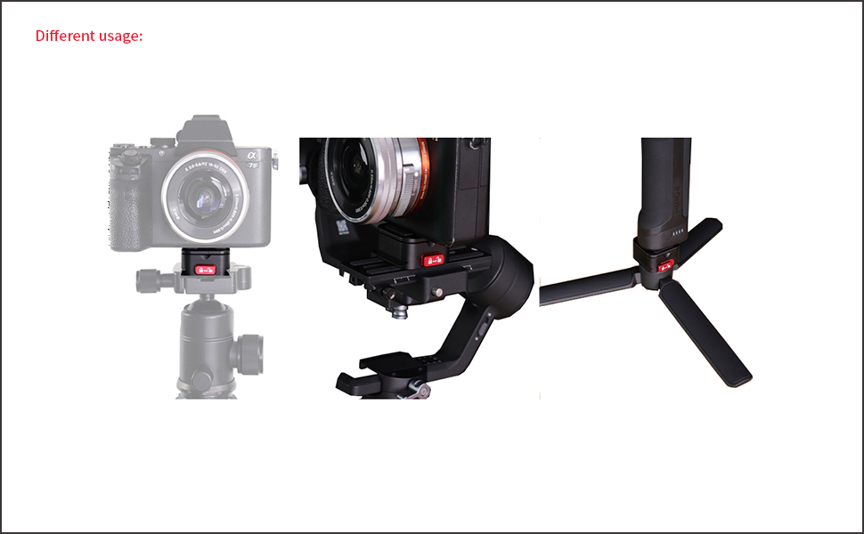 • Instead of traditional screw locker,this claw quick release camera plate is consisting of a QR plate and a base,which are easily taken apart by press the side buttons and this makes it work much quicker than the traditional one.