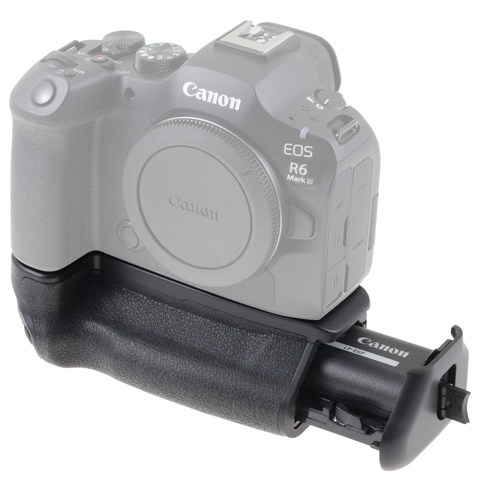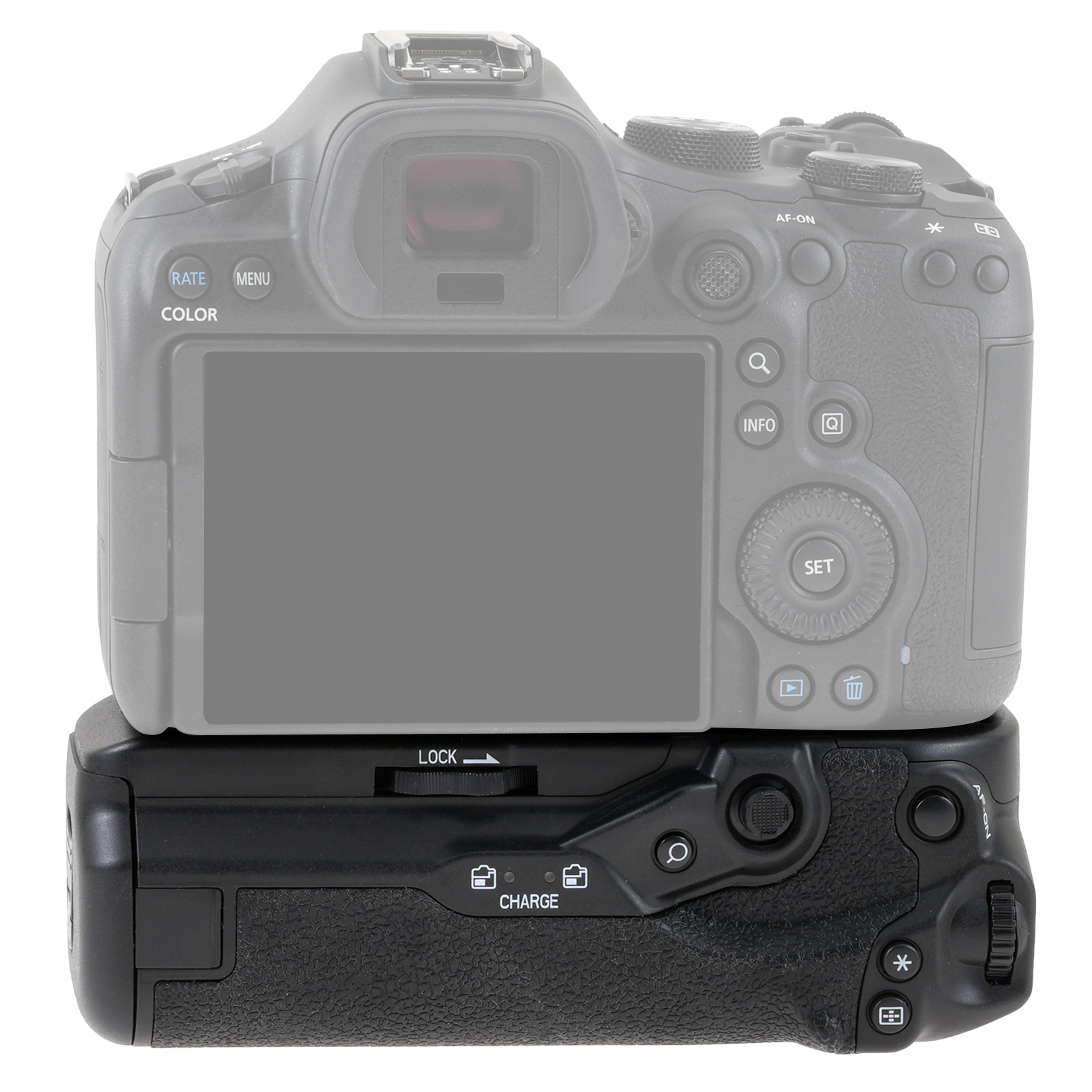 This grip features two independent battery compartments designed to hold LP-E6, LP-E6N, or LP-E6NH batteries.