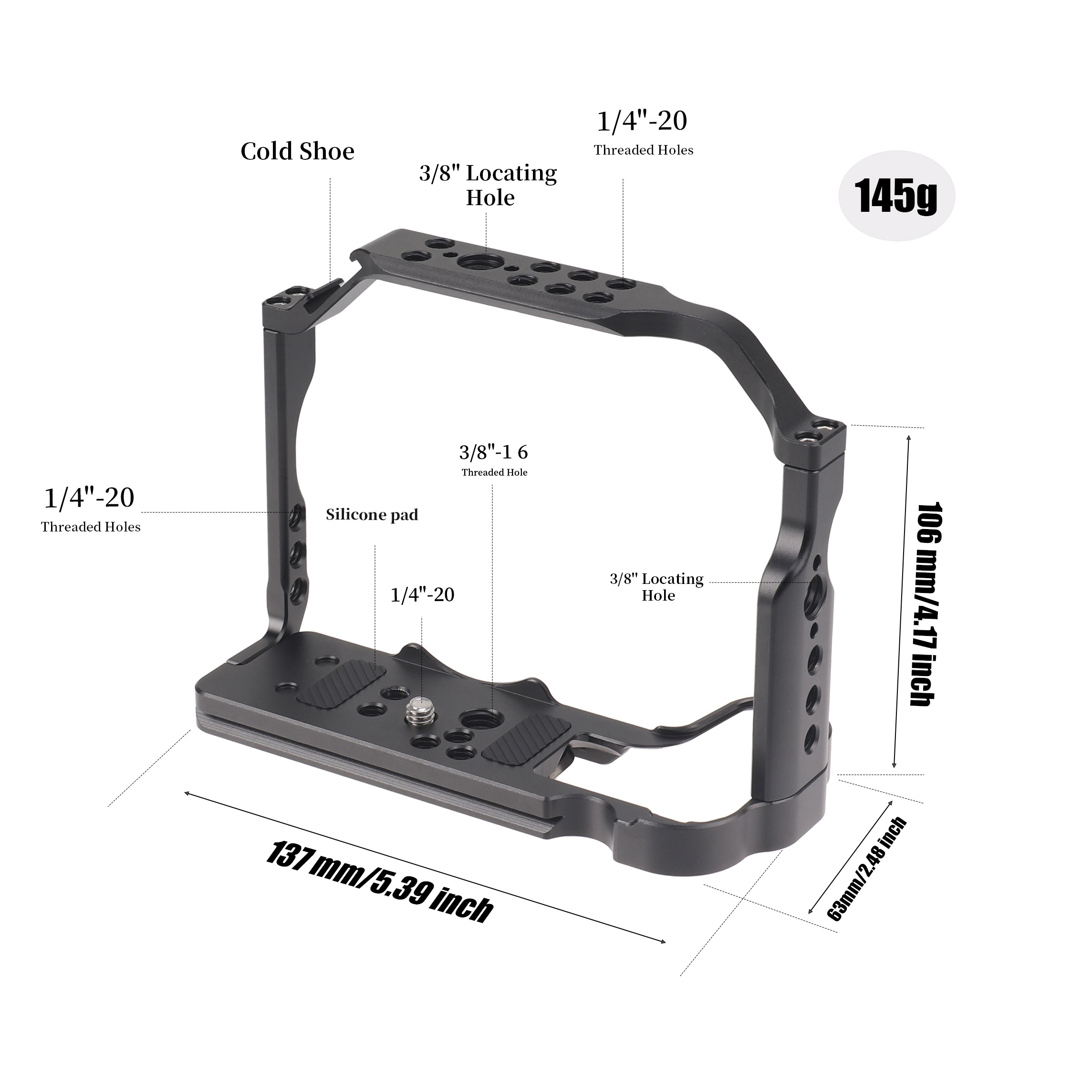 • Multiple 1/4″ and 3/8″ holes and a cold shoe for connecting more accessories like microphone,monitor,etc.3/8″ and 1/4″ hole at bottom,and arca-swiss type mount,allows the cage mount able to mount on different place like tripod,tripod ball head,etc.