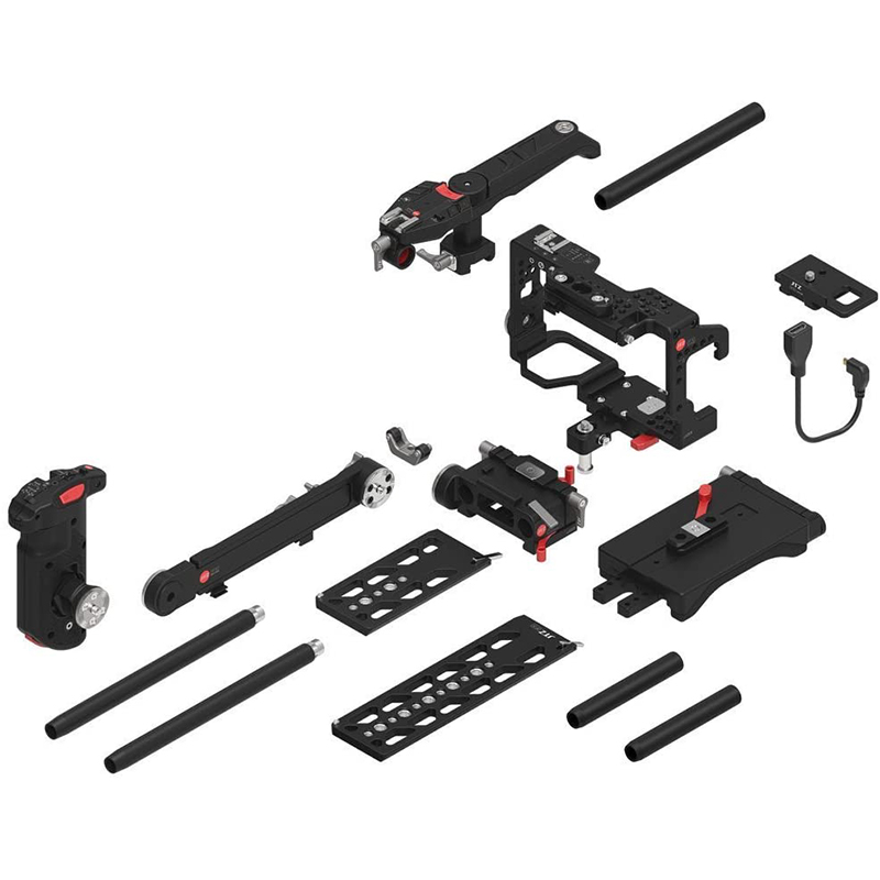 Electronic top handle and side handgrip, supports REC start/stop, focus, and zoom.