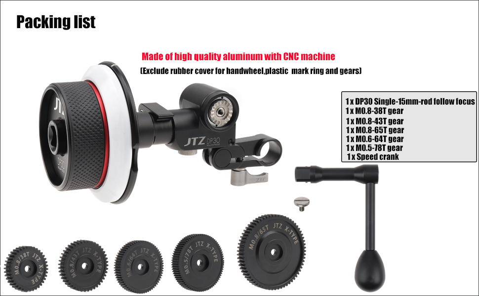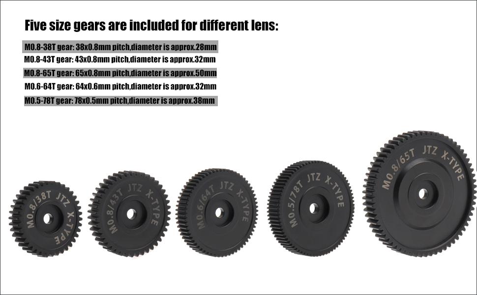 • Can use different size gears to meet your need with different lenses. This set comes with 5 size gears.(M0.8-38T/M0.8-43T/M0.8-65T/M0.6-64T/M0.5-78T)