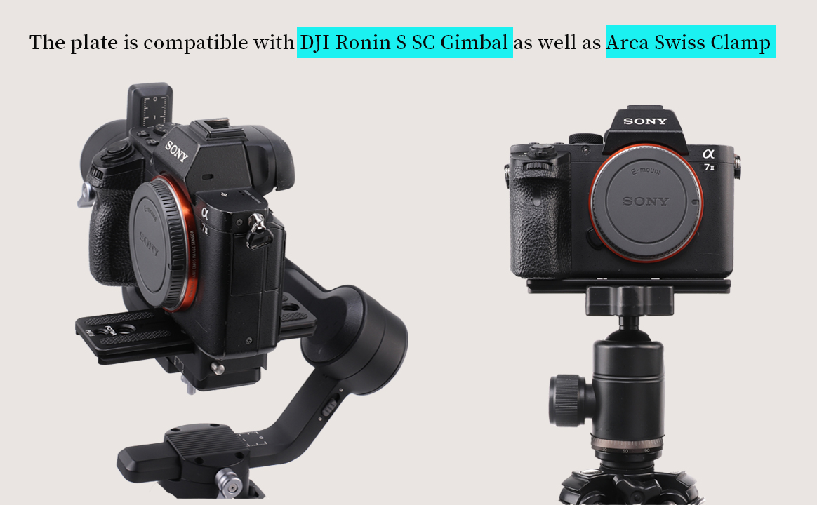 - [Also compatible with arca swiss tripod ball head clamp]Allows camera a quick switch between DJI Ronin S SC Gimbal and Arca swiss ball head.