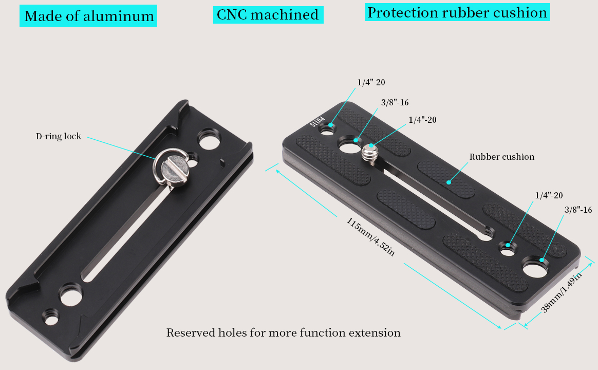 - D-ring lock 1/4″ mount for a quick and easy attach/detach from camera.Reserved 2x 1/4″ and 2x 3/8″ holes for more function extension. Rubber cushion protects camera from scratching and slipping.